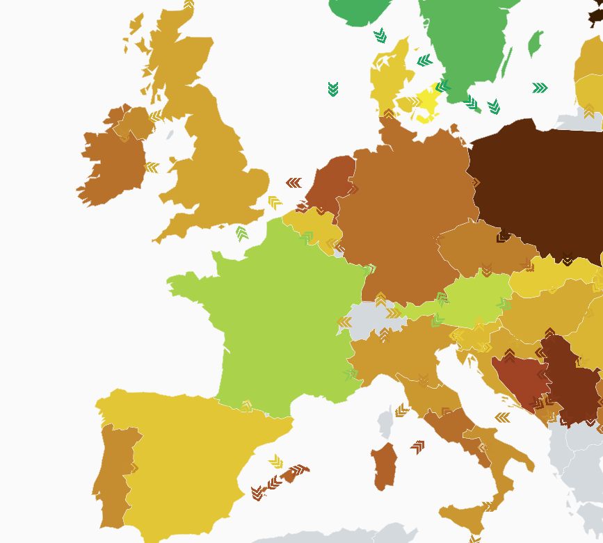 France :11% ; UK : 2 % ; Irlande : 5% ; Allemagne : 5% ; Espagne : 11 ; Pays-Bas : 21 ; Danemark : 9 ; Italie : 3.