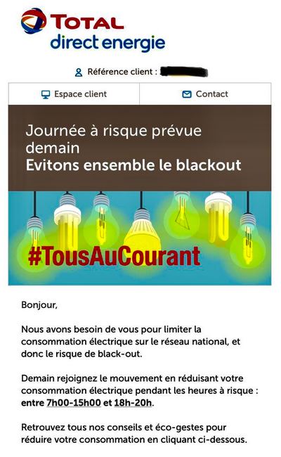 Pour revenir à la source, RTE a fait part du risque le 19 novembre seulement. Et RTE n’est pas seul pour communiquer sur ce risque. Même le fournisseur Total DirectEnergie s’est positionné sur la façon de préserver le système électrique… c’est que le problème est là.