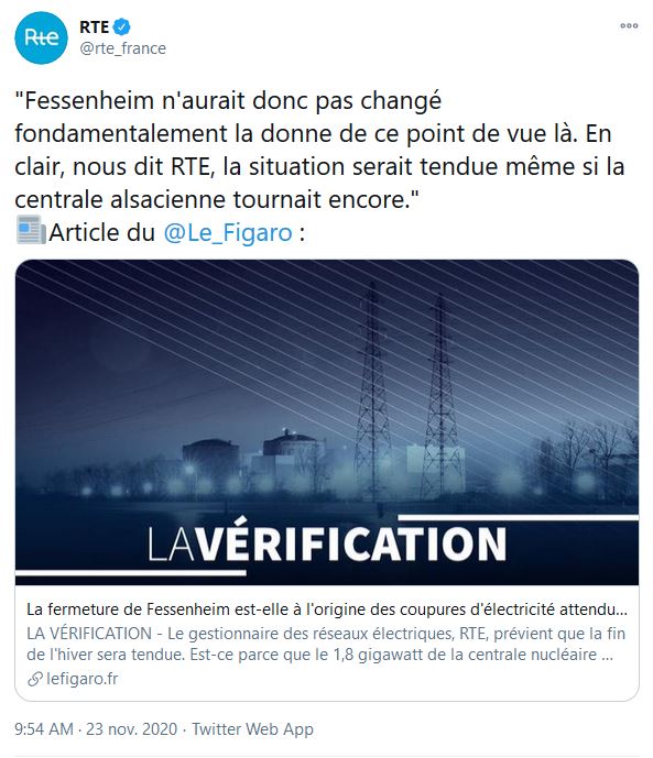 Donc RTE préfère appuyer sa démonstration en faisant parler des tiers au travers d’un média très grand public. Parmi eux, Nicolas Goldberg nous dit quelque chose de limpide, si Fessenheim avait été prolongé alors on aurait disposé de 1800 MW supplémentaire… ce qui n’aurait peut-être pas été suffisant. Tristan Kamin, membre de la société française d’énergie nucléaire, n’a rien dit d’autre.
