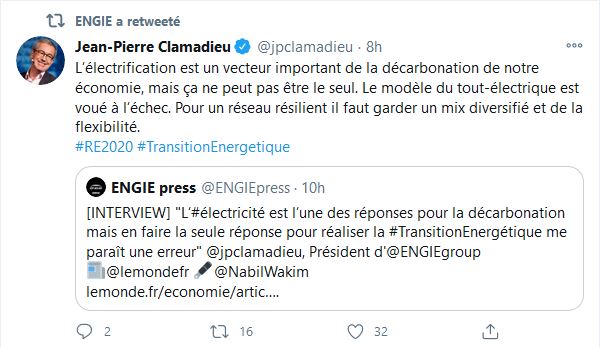 Pour Engie, mêmes difficultés, malgré des budgets communications tant pour Engie que pour EDF qui sont très très respectables, le gazier français nous propose cette décoration avec Jean-Pierre Clamadieu.